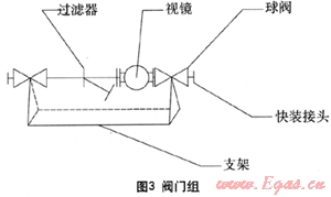圖3所示閥門(mén)組主要是將一些液相管路上必須的設(shè)備集成在一個(gè)支架上以滿足進(jìn)行快速的安裝需要。主要包括過(guò)濾器、視鏡、球閥、快裝接頭和支架。視鏡主要是用于觀測(cè)液相管路中液相輸送情況,其內(nèi)部自帶止回閥,可防止搶險(xiǎn)槽車(chē)中的液相回流至事故槽車(chē)。