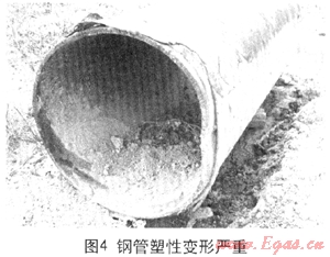 另外,施工單位應有回拖時卡管情況下的應急預案,龍大高速穿越卡管發(fā)生在第三塊孤石處,此時只需稍微后拉一下的擾動,再重新回拖時就可能錯過卡點。由于管道浮在泥漿中,這是不難做到的,而一味強拖則會越卡越緊。由于施工單位沒有合適的應急預案,結果發(fā)生卡管時應對失當,先是長時間停泵使泥漿干涸凝固,而后又在沒有鉆機有效引導情況下,用夯管錘暴力全程強夯,結果管段偏離管孔前行,導致鋼管塑性變形嚴重超標(圖4)。