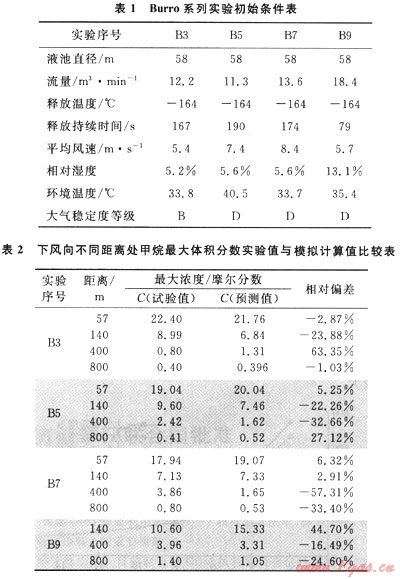 本文研究的數(shù)學模型通過Burro系列實驗[1,5]進行驗證,Burro實驗在距離泄漏源下風向57m、140m、400m、800m處分別測得天然氣的最大體積分數(shù)值,該實驗共進行了多組,本文對其中的3號、5號、7號和9號實驗進行模擬,將實驗數(shù)據(jù)與模型計算結(jié)果對比,并進行誤差分析,得出模型計算的平均相對偏差為24.28%。實驗的初始條件以及對比結(jié)果見表1、2。