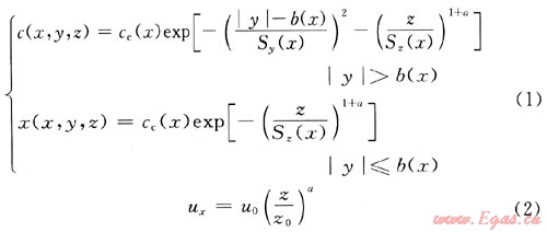 連續(xù)泄漏模型又稱穩(wěn)態(tài)模型,即下風向云團內(nèi)部的各種性質(zhì)參數(shù)只是位置的函數(shù)。DEGADIS作為積分模型,假設氣體擴散濃度在側(cè)風向上采用修正的高斯分布,而豎直方向上采用指數(shù)分布,并且對風速分布做了假設,其表達式如下: