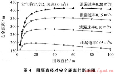 LNG儲罐周圍通常要設計圍堰,以防止儲罐發(fā)生泄漏時,液體四處流淌蔓延,若發(fā)生火災,還可以防止火焰蔓延到周邊地區(qū)[4]。LNG泄漏到圍堰內(nèi),會迅速蒸發(fā)氣化,形成以圍堰為二次源的蒸氣云團擴散。圖4給出下風向安全距離隨著圍堰直徑和泄漏速率的變化。當圍堰尺寸較小時,以圍堰為二次源云團的范圍也較小,有限的蒸發(fā)氣受大氣湍流影響,其濃度較快稀釋,安全距離較??;當圍堰尺寸過于增大時,二次源云團的天然氣濃度較低,其下風向擴散距離不再增加,反而略有減少。