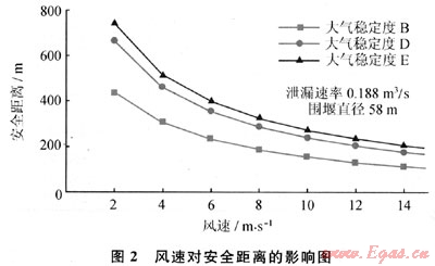 所建立的LNG泄漏氣體擴散模型計算方法,經(jīng)過實驗驗證,其平均偏差為24.28%,并較準確地體現(xiàn)了重氣擴散過程中云團內(nèi)部特性的變化規(guī)律。對于穩(wěn)態(tài)LNG氣體擴散,當風速大于2m/s時,隨著風速的增加,安全距離是逐漸減小的;對于較小風速(小于2m/s)時,該穩(wěn)態(tài)模型將不再適用。泄漏速率增大使安全距離幾乎成比例增大,是影響安全距離最重要因素之一。對于給定的LNG泄漏率,圍堰尺寸變化對安全距離的影響會呈現(xiàn)出一個弱峰,之后安全距離會隨圍堰尺寸的增加而略有減小。