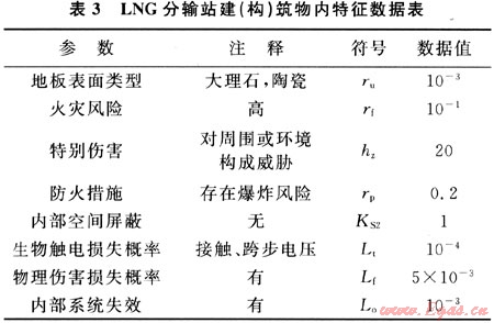經(jīng)檢測(cè),LNG分輸站內(nèi)綜合樓屋面存在避雷帶有未形成閉合回路、引下線與避雷帶焊接長(zhǎng)度未達(dá)到規(guī)范要求等缺陷,因此認(rèn)為外部防雷裝置(LPS)的取值選定為2×10-1,詳見表1。
