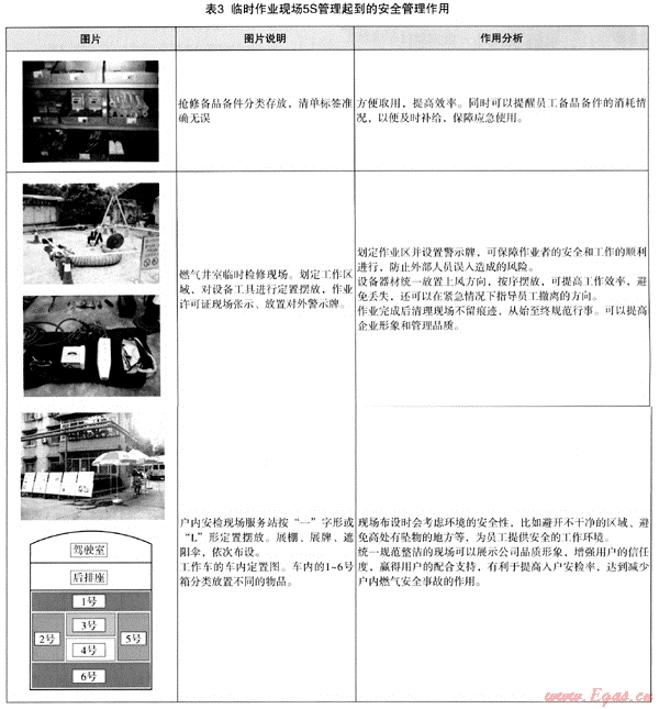 燃?xì)馄髽I(yè)是沒有“圍墻的工廠”,存在很多臨時(shí)作業(yè)場(chǎng)所。如:井室搶維修作業(yè)、戶內(nèi)安檢作業(yè)等。相對(duì)來說這些臨時(shí)性作業(yè)場(chǎng)所不穩(wěn)定因素較多,現(xiàn)場(chǎng)的安全控制更加重要。通過0HSAS18001我們可以識(shí)別了存在的風(fēng)險(xiǎn)、制定了安全措施和作業(yè)管理流程、以及應(yīng)急預(yù)案等,如果和5S現(xiàn)場(chǎng)定置管理結(jié)合起來,可以取得更好的成效。見表3: