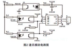 本機(jī)有時(shí)需外接工控機(jī)進(jìn)行精準(zhǔn)測量,所以本機(jī)留有RS485接口用于通訊。考慮到通訊可靠和操作員的安全,本機(jī)通訊接口采用了光電隔離。通訊模塊電路布置如圖2。
