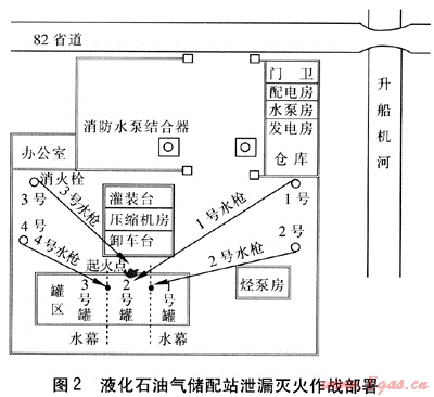 臺州市江北燃氣有限公司為臺州燃氣有限公司下屬子公司,其液化石油氣儲配站位于臺州市章安鎮(zhèn)華景村邊,儲配站東面為河道,南面西面為橘樹園,北面為82省道。站邊河道寬近20m,可作為消防水源。站內有50m3臥式儲氣罐2臺、20m3臥式殘液罐1臺,采用地下儲罐形式,燃氣管道全部安裝在地面。為了增強公司員工應對突發(fā)事故的應急能力,也為了更好地充實、改進和完善公司的安全生產(chǎn)事故應急救援機制和操作規(guī)程,每年經(jīng)常組織多種形式的消防滅火和液化石油氣泄漏搶險演練。