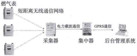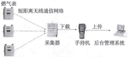 無線燃氣表通過自身攜帶的無線通信模塊與采集器實現(xiàn)無線通信,采集器定期主動采集燃氣表的數(shù)據(jù)并儲存,工作人員通過手持機與采集器通信將表中的數(shù)據(jù)下載到手持機中。此種抄表系統(tǒng)中的通信方式均為短距離通訊網(wǎng)絡。該技術僅僅將有線抄表技術更換成無線通訊,依然需要工作人員定期將數(shù)據(jù)下載到手持機中,比較落后。