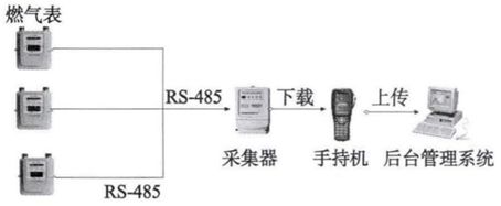 有線抄表系統(tǒng)主要由燃氣表、采集器和手持機構(gòu)成,其原理如圖2所示。燃氣表通過通信總線與采集器相連,采集器定期采集燃氣表數(shù)據(jù)并存儲于芯片中。工作人員通過手持機讀取采集器中所存儲的燃氣表數(shù)據(jù)并將其上傳到燃氣企業(yè)后臺管理系統(tǒng)。