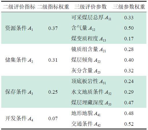 利用層次分析法對(duì)鎮(zhèn)威煤田各礦區(qū)中的煤層氣選區(qū)的關(guān)鍵要素進(jìn)行定量排序, 將研究區(qū)煤層氣資源、儲(chǔ)集條件、保存條件和煤層氣開發(fā)基礎(chǔ)條件作為4 個(gè)二級(jí)評(píng)價(jià)指標(biāo),每個(gè)二級(jí)評(píng)價(jià)指標(biāo)對(duì)于煤層氣開發(fā)的影響又受多個(gè)三級(jí)參數(shù)的影響,包括可采煤層總厚、含氣量、資源豐度、揮發(fā)分含量、鏡質(zhì)組含量、煤層穩(wěn)定性、灰分含量、頂?shù)装鍘r性、水文地質(zhì)條件、煤層埋藏深度、地形地貌及交通條件(表3)。