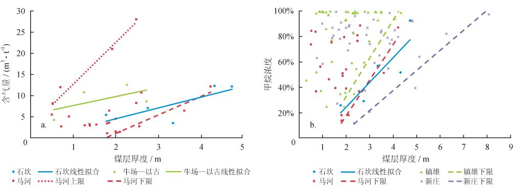 含氣量與煤厚大體上呈正相關(guān)關(guān)系,部分礦區(qū)含氣量與煤厚呈較明顯的線性正相關(guān)關(guān)系,如石坎礦區(qū)(相關(guān)系數(shù)R 為0.6)。較常見的情況是含氣量與煤層厚度之間存在一定的離散性,但其中煤層厚度與含氣量上限及含氣量下限同時(shí)存在較明顯的線性關(guān)系,如馬河礦區(qū)(圖5-a)。甲烷濃度的下限與煤厚普遍表現(xiàn)為正相關(guān)關(guān)系,反映煤層厚度的增加有助于煤層氣的保存(圖5-b)。總之,煤層厚度不僅控制了煤儲(chǔ)層的生氣潛力,對(duì)煤層氣保存也有一定影響,在煤層頂?shù)装灞4鏃l件不理想的情況下,煤層厚度對(duì)含氣量的影響更為顯著。