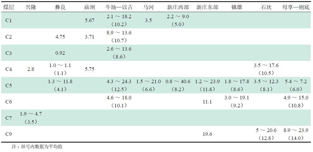 鎮(zhèn)威煤田以龍?zhí)督M上段C5 煤層為主要可采煤層,全區(qū)穩(wěn)定分布,局部可采煤層主要為C1、C6、C7 和C9 煤層,煤層總厚度由東向西方向先變厚再變薄(圖2、4)。龍?zhí)督M下部C9 煤層分布穩(wěn)定,結(jié)構(gòu)簡(jiǎn)單,在鎮(zhèn)威煤田東部為可采煤層。C6 煤層主要分布在研究區(qū)東部,向西至廟壩礦區(qū)逐漸變薄尖滅。C1 煤層在中部新莊、馬河、牛場(chǎng)—以古礦區(qū)可采,向東西兩側(cè)變薄尖滅。C2、C3、C4 煤層在煤田東部及西部局部可采。