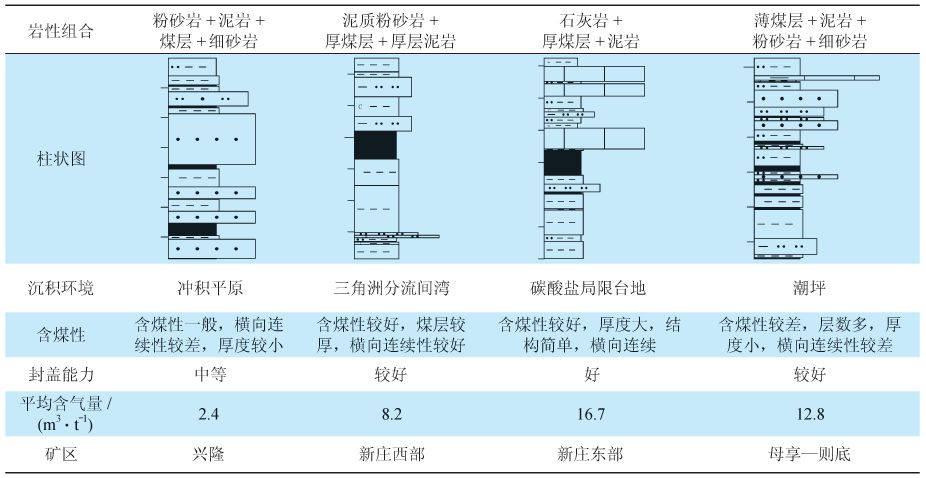 龍?zhí)督M主要為海陸過(guò)渡相沉積,包括三角洲平原、潮坪沉積相。長(zhǎng)興組主要為海相沉積,以碳酸鹽潮下帶為主,煤層頂?shù)装鍘r性組合包括沖積平原中的粉砂巖+泥巖+煤層+細(xì)砂巖、碳酸鹽局限臺(tái)地中的石灰?guī)r+厚煤層+泥巖、三角洲間灣中的泥質(zhì)粉砂巖+厚煤層+厚層泥巖以及潮坪中的薄層煤層+泥巖+粉砂巖+細(xì)砂巖(表2)??傮w上,海陸過(guò)渡相沉積封蓋能力較強(qiáng),陸相沉積封蓋能力較弱,符合常見沉積體系與封蓋體系之間的關(guān)系[20-21]。