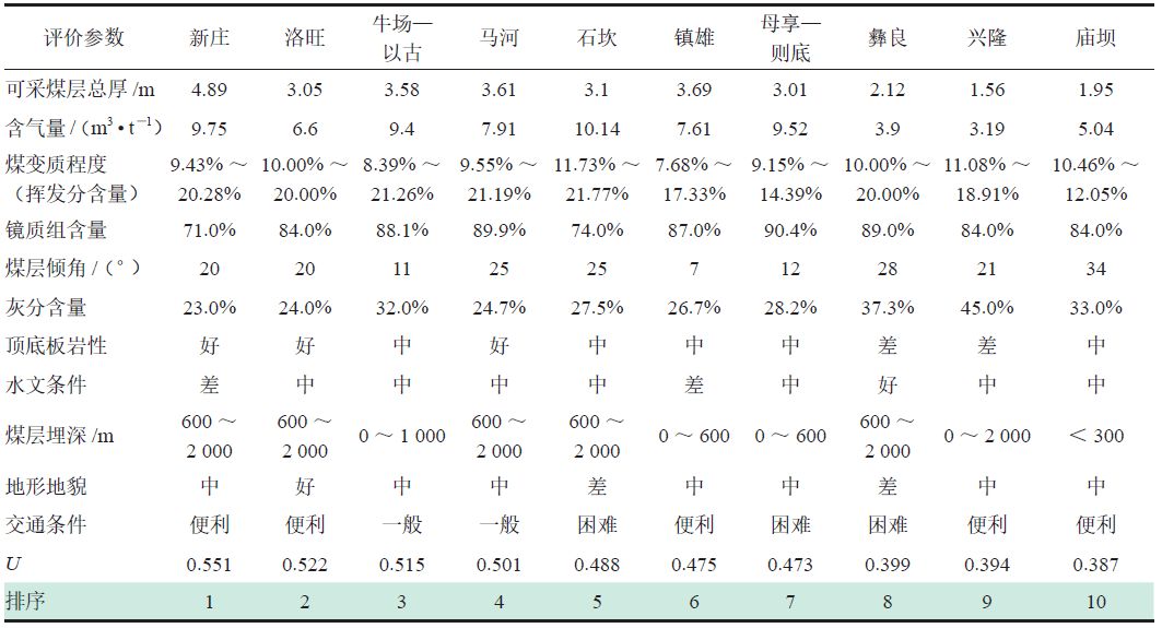根據(jù)表4 建立的評(píng)價(jià)參數(shù)權(quán)重體系對(duì)鎮(zhèn)威煤田中新莊、石坎、母享—則底、鎮(zhèn)雄等10 個(gè)礦區(qū)的煤層氣勘探潛力指數(shù)U 進(jìn)行計(jì)算,結(jié)果表明有4 個(gè)礦區(qū)具有較好的勘探潛力(U > 0.5),其中新莊礦區(qū)煤層氣開發(fā)潛力最好,其次為洛旺礦區(qū)、牛場(chǎng)—以古礦區(qū)和馬河礦區(qū),其他礦區(qū)開發(fā)潛力相對(duì)較差,如表5 所示。
