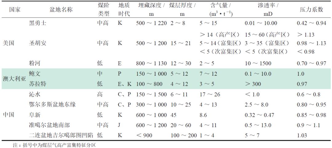 表1 中外煤層氣主力產(chǎn)區(qū)儲層參數(shù)對比表