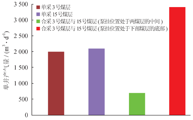 圖1 沁水盆地3 號、15 號煤層合采與單采情況下單井產(chǎn)氣量對比圖