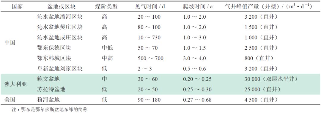 表2 中外煤層氣產(chǎn)區(qū)氣井見氣時(shí)間、產(chǎn)氣爬坡期數(shù)據(jù)對比表