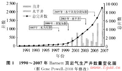 開發(fā)技術(shù)的創(chuàng)新尤其是水平井鉆井、壓裂技術(shù)以及裂縫綜合診斷技術(shù)的進(jìn)步與廣泛運(yùn)用在推動(dòng)沃斯堡盆地Barnett頁(yè)巖氣藏的快速發(fā)展中起著至關(guān)重要的作用。1981年,Barnett頁(yè)巖區(qū)在按計(jì)劃鉆探過(guò)程中偶然發(fā)現(xiàn)顯示良好的Barnett頁(yè)巖層段。自1981年第一口發(fā)現(xiàn)井到1992年歷經(jīng)10a生產(chǎn)井僅99口,開發(fā)緩慢。1997年后,水力壓裂開始取代凝膠壓裂成為頁(yè)巖氣主要的增產(chǎn)措施,Barnett頁(yè)巖氣的開發(fā)也隨之加快了前進(jìn)的步伐。隨著1999年重復(fù)壓裂、2003年水平鉆井以及2005年水平井分段壓裂等一系列新技術(shù)的廣泛運(yùn)用,Barnett頁(yè)巖氣發(fā)展速度驚人(圖2),從1997~2007年的10a時(shí)間里,Barnett頁(yè)巖氣區(qū)有多達(dá)8629口頁(yè)巖氣井投入生產(chǎn)(其中水平井4973口,占50%以上)。新技術(shù)的運(yùn)用同樣使Barnett頁(yè)巖氣產(chǎn)量發(fā)生了翻天覆地的變化,截至2008年1月,Barnett頁(yè)巖氣產(chǎn)量約0.996×108m3/d,累計(jì)產(chǎn)量1044.9×108m3[3]。