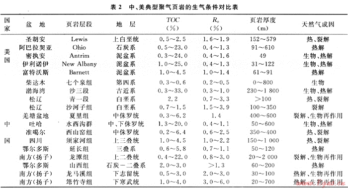 中國與美國在頁巖氣富集條件上具有許多相似之處,美國頁巖氣大規(guī)模的成功開發(fā)為中國的頁巖氣勘探研究提供了參考模式。在美國,圍繞加拿大地盾南緣形成了廣泛的古生界海相沉積,后期的改造和演化形成了現(xiàn)今呈弧形展布的一系列盆地;在中國,塔里木、華北和揚(yáng)子地臺(tái)及其周緣廣泛發(fā)育了不同地質(zhì)時(shí)代的多套黑色頁巖,其頁巖氣形成條件完全可與北美相媲美(表2)。以美國東部與中國南方為例,兩者分別在頁巖發(fā)育時(shí)代、地層沉積格局、有機(jī)質(zhì)熱演化程度、后期構(gòu)造演化、破壞程度與保存條件、頁巖含氣性以及頁巖氣聚集模式等方面具有可比之處。從兩者系統(tǒng)對(duì)比的結(jié)果可以看出,中國頁巖氣形成的地質(zhì)條件優(yōu)越。