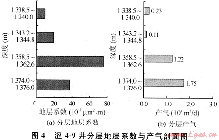 澀北一號(hào)氣田四-1單元各井滲透率5.4×10-3~49.1×10-3μm2,滲透率級(jí)差為1.8~54.7,各井表現(xiàn)為強(qiáng)中等非均質(zhì)性。產(chǎn)氣剖面測(cè)試結(jié)果表明,各井在縱向上產(chǎn)量貢獻(xiàn)差異非產(chǎn)大。如澀4-9井最大滲透率為16.3×10-3μm2,滲透率級(jí)差為3.7,地層系數(shù)越高(圖4-a),分層產(chǎn)量也越高(圖4-b),由此可見(jiàn),多層合采時(shí)層間非均質(zhì)性嚴(yán)重影響低滲層的儲(chǔ)量動(dòng)用。