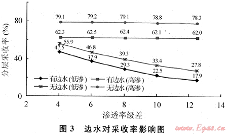 根據(jù)澀北氣田水體能量,水體體積大小為20倍烴類(lèi)體積,日產(chǎn)氣量2×104m3。應(yīng)用數(shù)值模擬單井模型,邊水采用網(wǎng)格水體,模擬表明:滲透率級(jí)差越大,儲(chǔ)量動(dòng)用程度越低,邊水對(duì)采收率影響越大。多層合采開(kāi)發(fā),邊水對(duì)高滲層影響大,由圖3可以看出高滲層的分層采收率,存在邊水條件下比定容氣藏減少16.3%~16.9%,低滲層則只減少8.4%~10.8%。模擬表明:高滲儲(chǔ)層壓力下降速度明顯高于低滲層,邊水突破后嚴(yán)重影響低滲層儲(chǔ)量動(dòng)用。