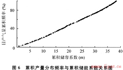 由圖6可以看出:日產(chǎn)氣量與累計(jì)儲(chǔ)容系數(shù)相關(guān)性很好。表明分層產(chǎn)量除受地層系數(shù)影響外,還與儲(chǔ)容系數(shù)有關(guān),即高滲層的儲(chǔ)量決定了氣井的產(chǎn)量水平和穩(wěn)產(chǎn)能力。綜合分析認(rèn)為,四-1單元高滲層中儲(chǔ)量所占比例較少,不能滿足目前氣井配產(chǎn)的穩(wěn)產(chǎn)需求,由此表現(xiàn)出氣井產(chǎn)量遞減。