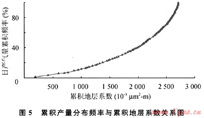 選用該射孔單元共17口井55井次產(chǎn)氣剖面測(cè)試數(shù)據(jù),同一口井多次測(cè)試分層產(chǎn)量選取其平均產(chǎn)量。按滲透率由大到小進(jìn)行排序,對(duì)各小層的產(chǎn)量、地層系數(shù)(Kh)和儲(chǔ)容系數(shù)(φhSg)進(jìn)行累加,作累積產(chǎn)量分布頻率與累積地層系數(shù)關(guān)系圖(圖5)。