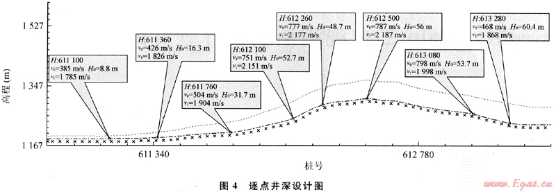 圖3是利用GeoMountain采集工程師表層調(diào)查軟件對小折射控制點和微測井控制點的資料處理和解釋結(jié)果。根據(jù)工區(qū)所有控制點解釋結(jié)果,建立表層模型,有效地指導(dǎo)了地震采集激發(fā)井深設(shè)計。圖4是利用表層模型所做的逐點井深設(shè)計。