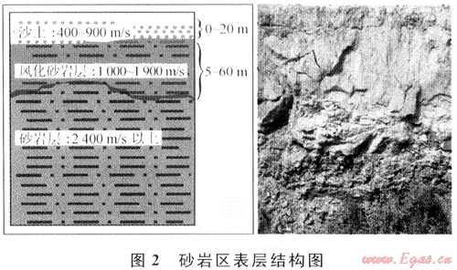 該區(qū)地表巖性復(fù)雜,表層結(jié)構(gòu)縱、橫向變化較大(見圖2)。在堿灘堿湖、沙漠區(qū)用小折射方法,砂巖出露區(qū)用微測井方法進行表層調(diào)查。