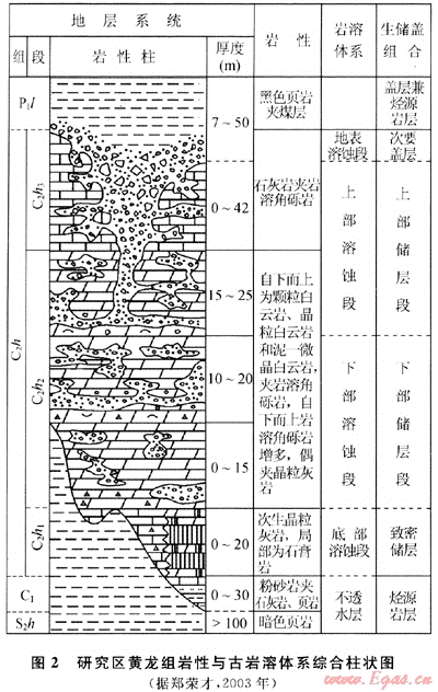 位于四川盆地東部的渝北-鄰水地區(qū)在范圍上包括重慶市的渝北區(qū)、北碚區(qū)和四川省的鄰水縣與華鎣山市,面積約3900km2(圖1)。上石炭統(tǒng)黃龍組為該地區(qū)天然氣主要產(chǎn)層,儲(chǔ)層屬于古巖溶成因類(lèi)型[5~7],區(qū)內(nèi)發(fā)育有鄰北、板東、板橋、座洞崖、銅鑼?shí){、相國(guó)寺和環(huán)山等眾多次一級(jí)構(gòu)造控制的黃龍組氣藏,具備很大的勘探開(kāi)發(fā)潛力。研究區(qū)石炭系受海西早期強(qiáng)烈構(gòu)造隆封和侵蝕作用,只殘存了不完整的上石炭統(tǒng)黃龍組拱不整合超覆在中志留統(tǒng)韓家店組暗色泥頁(yè)巖之上,頂面被下二疊統(tǒng)梁山組煤系地層超覆,自下而上被劃分為3個(gè)巖性和巖相截然不同的巖性段[8](圖2)。
