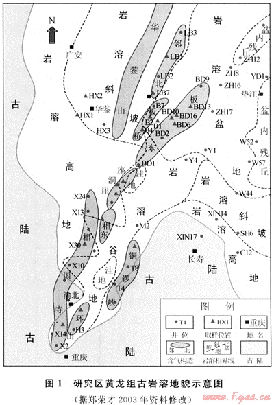 碳酸鹽礦物鍶同位素地球化學(xué)特征是碳酸鹽巖成因分析最重要的證據(jù)之一[1~2],近年來(lái)國(guó)外將鍶同位素地球化學(xué)特征廣泛地應(yīng)用于碳酸鹽巖石學(xué)、巖相古地理和儲(chǔ)層地質(zhì)學(xué)等研究領(lǐng)域中,而將其應(yīng)用到碳酸鹽巖古巖溶儲(chǔ)層中的成果則很少[3~4]。筆者僅就渝北-鄰水地區(qū)上石炭統(tǒng)黃龍組古巖溶儲(chǔ)層的鍶同位素特征對(duì)巖溶過(guò)程的流體性質(zhì)和古水文條件展開(kāi)討論,為預(yù)測(cè)和評(píng)價(jià)此類(lèi)儲(chǔ)層提供有關(guān)的地質(zhì)-地球化學(xué)信息。