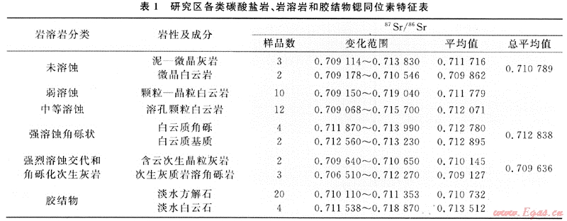 包括未溶蝕的正常海相泥-微晶灰?guī)r和薩勃哈環(huán)境的微晶白云巖,此兩類(lèi)樣品的分析結(jié)果,主要用作為代表地層鍶同位素背景值和描述與對(duì)比巖溶巖系溶蝕過(guò)程中鍶同位素變化規(guī)律的參照物。