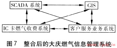 對于大慶燃氣SCADA、GIS、客戶服務(wù)業(yè)務(wù)系統(tǒng)、IC卡燃氣收費系統(tǒng),在建設(shè)初期即考慮到各系統(tǒng)對接、數(shù)據(jù)共享等系統(tǒng)間的整合問題。整合后的大慶燃氣信息管理系統(tǒng)見圖7。