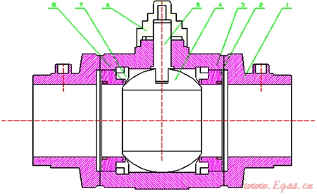 PE球閥是由塑料配件組成的全封閉式結(jié)構(gòu),由接管座1,閥座2,閥殼體3,閥球4,閥桿5,扳手6,擋圈7,密封圈8組成。其中接管座1,閥座2,閥殼體3采用與管體相同的PE材料制成,閥球4,閥桿5,扳手6,擋圈7用比主體材料硬度、強度更高的其他塑料制成。通過閥座2,擋圈7來固定密封圈8,并構(gòu)成閥座組合體,分布在閥球8的兩側(cè),閥桿環(huán)形凹槽上的密封圈和扳手內(nèi)腔上的密封圈保證了PE球閥在閥桿5、扳手6處的密封性,而閥殼體3、閥座2與接管座1又通過熱熔方式組合成一整體,保證了連接處的嚴密性,因此PE球閥在通常情況下不會產(chǎn)生外泄漏現(xiàn)象。