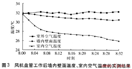 2006年8月7日對風機盤管工作后墻內(nèi)壁面溫度、室內(nèi)空氣溫度的實測結(jié)果見圖3。由圖3可知,墻內(nèi)壁面實測初始溫度為31.8℃,實測室內(nèi)初始空氣溫度為31.6℃。隨著風機盤管的開啟,墻內(nèi)壁面溫度平緩下降,30min后降至30.5℃,由于時間較短,可以近似認為墻內(nèi)壁面溫度保持不變。風機盤管工作30min后,室內(nèi)空氣溫度由31.6℃降至26℃,風機盤管工作時間與計算結(jié)果(18~23min)相差不大。