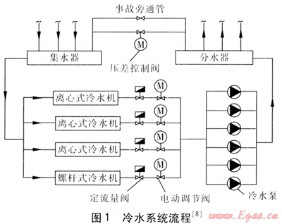 為了保證在部分負荷時冷水機組的高效運行,選用3臺離心式冷水機與1臺螺桿式冷水機,在過渡季節(jié)或負荷較小時,只開啟螺桿式冷水機。冷水機進出水溫度為13、7℃,冷水機與附屬設(shè)備見表1[8]??照{(diào)水系統(tǒng)為一次泵、末端變流量、機組側(cè)定流量系統(tǒng),采用二管制,豎向不分區(qū),末端空調(diào)裝置采用風機盤管,冷水系統(tǒng)流程見圖1㈨。