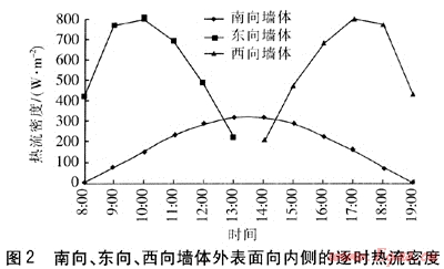 墻體內外側表面?zhèn)鳠嵯禂?shù)分別取8.7、23.3W/(m2·K),根據(jù)文獻[7]提供的圍護結構基本耗熱量及圍護結構傳熱系數(shù)計算式,計算得出圍護結構傳熱系數(shù)為0.3W/(m2·K)。若室內溫度保持18℃,根據(jù)傳統(tǒng)墻體供暖熱負荷計算方法,得到單位面積基本耗熱量為17.7W/m2。由圖2可知,除了南向墻體8:00、19:00兩個時刻熱流密度小于17.7W/m2外,其余時刻在太陽輻射條件下3個朝向墻體外表面向內側的熱流密度均遠高于單位面積基本耗熱量。因此,在實際設計及運行中,應根據(jù)建筑墻體朝向及太陽輻射情況,采用合理的供暖系統(tǒng)運行方案,這樣既能滿足供熱要求,又能合理地使用能源,降低運行成本。
