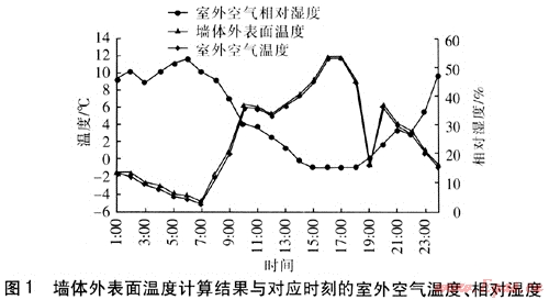 為了對太陽輻射條件下墻體外表面向內側的傳熱量進行分析,選定墻體結構及材料熱工性能參數(shù)見表1,熱工性能參數(shù)滿足DB 63/643—2007《青海省居住建筑節(jié)能設計標準》。墻體外表面為淺色涂料,建筑物四周為綠色草坪。墻體外表面溫度采用有限差分法進行計算,并采用ANSYS計算軟件對結果進行校核。墻體外表面溫度計算結果與對應時刻的室外空氣溫度、相對濕度見圖1。