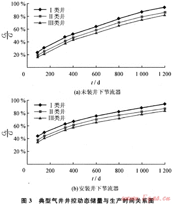 氣井在各生產(chǎn)階段的單位套壓降產(chǎn)氣量的變化規(guī)律直接反映了氣井井控動(dòng)態(tài)儲(chǔ)量隨生產(chǎn)時(shí)間變化的規(guī)律。采用FAST.RTA軟件對(duì)這些氣井進(jìn)行動(dòng)態(tài)分析,求得不同生產(chǎn)時(shí)間的井控動(dòng)態(tài)儲(chǔ)量(Gt),發(fā)現(xiàn)Gt-t與Gt/△pc2-t有相同的變化規(guī)律,Gt在早期隨生產(chǎn)時(shí)間t增加而快速增大,后期逐漸趨緩變平,兩者之間呈良好的二次多項(xiàng)式關(guān)系;當(dāng)Gt不再隨生產(chǎn)時(shí)間增大時(shí),可認(rèn)為已達(dá)到了最大井控動(dòng)態(tài)儲(chǔ)量,記為Gt歸納這些氣井的Gt/G-t關(guān)系,可得到3類典型氣井井控動(dòng)態(tài)儲(chǔ)量隨生產(chǎn)時(shí)間變化的關(guān)系圖版。在研究過(guò)程中發(fā)現(xiàn)氣井的生產(chǎn)制度對(duì)井控動(dòng)態(tài)儲(chǔ)量的變化規(guī)律有較大影響,氣井初始配產(chǎn)越高,其初始階段的井控動(dòng)態(tài)儲(chǔ)量和泄流面積越小。蘇里格早期投產(chǎn)井大部分未安裝井下節(jié)流器,初始配產(chǎn)較高,而近年來(lái)投產(chǎn)的氣井普遍采用了井下節(jié)流技術(shù),初始配產(chǎn)較低(圖3)。