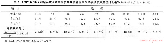 LG17井38機(jī)配帶ST-A型廢水廢氣同步消減裝置與2#機(jī)對比,排氣背壓(表1)與噪聲(表2)同步下降。鉆進(jìn)工況為柴油機(jī)轉(zhuǎn)速1200r/min,2#機(jī)排氣背壓實(shí)測值2.3~2.5kPa,3#機(jī)僅660Pa,降低70%以上。該工況下按噪聲監(jiān)測規(guī)范在3個(gè)方位分別檢測單開3#機(jī)和單開2#機(jī)的噪聲頻譜(表2),3#機(jī)倍頻帶消聲效果均優(yōu)于2#機(jī),2kHz以上高頻段降噪效果更明顯,4kHz降幅達(dá)最大值-23.7%。