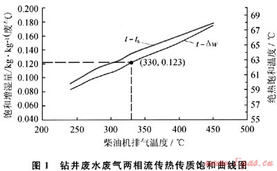 根據(jù)氣液兩相流直接接觸傳熱傳質(zhì)等焓過程原理[9],設(shè)柴油機(jī)排氣溫度(t)、濕含量(H)、比熱(Cp),與廢水傳熱傳質(zhì)達(dá)到飽和溫度(ts)、飽和濕含量(Hs),廢水汽化熱(γ),則單位質(zhì)量廢氣飽和增濕量理論值為: