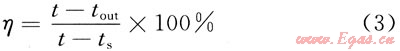 圖1的t-ts曲線還提供了與柴油機(jī)排氣溫度(t)相對應(yīng)的飽和溫度(ts),若實(shí)測同步處理后廢氣溫度下降到tout,則根據(jù)式(3)定義的設(shè)備運(yùn)行效率可判斷運(yùn)行狀態(tài),一般應(yīng)在90%~98%范圍。