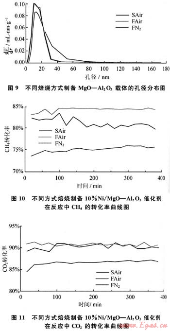 圖10、圖11為不同方式焙燒MgO-Al203載體制備10%Ni/ MgO-Al203催化劑在反應(yīng)中CH4和CO2的轉(zhuǎn)化率。從圖10、11中可以看出,流動空氣條件下焙燒載體催化劑的催化活性較好,CH4和CO2的轉(zhuǎn)化率分別可以達(dá)到82%和92%左右,隨著反應(yīng)的進(jìn)行,流動空氣焙燒催化劑的催化活性一直較為穩(wěn)定,表明催化劑的穩(wěn)定性較好。