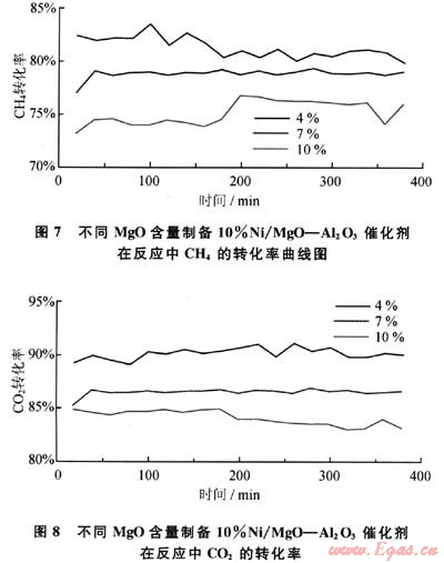 圖7、圖8為不同含量MgO-Al203載體制成10%Ni/MgO-Al203催化劑在反應(yīng)中CH4和CO2的轉(zhuǎn)化率。從圖7、8中可以看出,在反應(yīng)過程中10%Ni/4%MgO-Al203催化劑的催化活性最高,CH4和CO2轉(zhuǎn)化率分別為82%和90%左右。隨著反應(yīng)的進(jìn)行,10%Ni/4%MgO-Al203催化劑的催化活性略有浮動,但其轉(zhuǎn)化率仍然較高,在整個反應(yīng)過程中催化劑的催化活性變化都不是很大,表明其穩(wěn)定性較好。