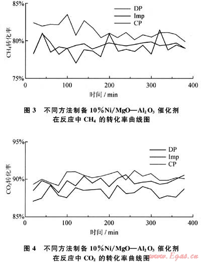 用不同方法制備4%MgO-Al203載體,用浸漬法負(fù)載Ni,制備成10%Ni/4%MgO-Al203催化劑,在常壓固定床反應(yīng)器中測得CHn的轉(zhuǎn)化率(XCH4)和C02的轉(zhuǎn)化率(XCO2)(圖3、4)。從圖3、4中可以看出,在反應(yīng)開始階段共沉淀法制備的載體催化劑的初始活性較高,可以超過90%,高于沉積沉淀法和浸漬法的催化活性,隨著反應(yīng)時間的進(jìn)行,CH4和C02的轉(zhuǎn)化率始終保持較高,但反應(yīng)進(jìn)行4h后,催化劑發(fā)生了積炭,催化活性有所降低,說明其穩(wěn)定性不是很好。