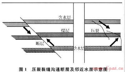 由于煤巖非均質(zhì)性強(qiáng),微孔隙、微裂縫發(fā)育,且斷裂韌性比常規(guī)砂巖、泥巖低,在水力壓裂施工過(guò)程中裂縫擴(kuò)展不完全受地應(yīng)力方位控制,還受濾失高的主天然裂縫控制。部分井在壓裂施工過(guò)程中,煤層破碎明顯,隨著裂縫的延伸,壓穿了上下砂巖層或連通了斷層,從而溝通了鄰近水層(圖1),在排采過(guò)程中產(chǎn)水量大,排水降壓困難,產(chǎn)氣量低或完全不產(chǎn)氣[11]。