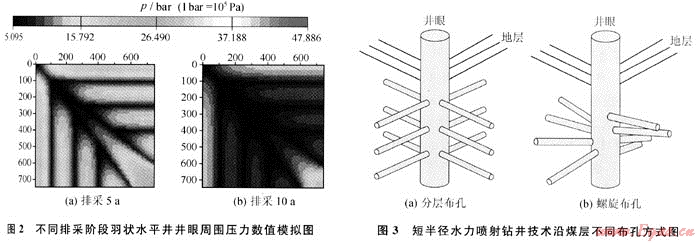短半徑水力噴射鉆井技術(shù),其特點(diǎn)是可以實(shí)現(xiàn)在0.12m直徑的立井井段中完成從垂直轉(zhuǎn)向水平,并可以沿不同方位對(duì)煤層鉆水平孔眼開(kāi)采煤層氣(圖3)。與常規(guī)直井水力壓裂相比,短半徑水力噴射鉆井具備定向效果好、穿透深度長(zhǎng)等一系列技術(shù)優(yōu)勢(shì)[12~13]:①水力噴射可以沿井筒任意方位進(jìn)行,從而可根據(jù)煤儲(chǔ)層應(yīng)力分布情況,使水平孔眼最大限度地溝通煤層天然裂縫,提高裂縫的導(dǎo)流能力;②能根據(jù)需求在煤層中沿不同方位鉆出120m以上的長(zhǎng)直孔,從而可以增大井眼與煤儲(chǔ)層接觸面積,擴(kuò)大煤層氣井的降壓解吸范圍;③煤層鉆孔后,孔眼周?chē)簝?chǔ)層應(yīng)力降低,形成新的微裂紋,從而可以提高水平孔眼周?chē)簝?chǔ)層透率;④水平孔眼可采取分層布孔或螺旋布孔,通過(guò)優(yōu)化孔眼結(jié)構(gòu)、充分利用孔眼間相互干擾作用可加快區(qū)域煤層氣降壓解吸,提高煤層氣井單井產(chǎn)量。