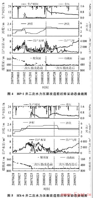 以HP-1井和HX-6井為例(如圖4、5所示)。HP-1井二次壓裂改造前套壓僅0.05MPa左右,產(chǎn)氣385m3/d,產(chǎn)水2.1m3/d,通過(guò)采取活性水二次壓裂(壓裂液液量134.4m3,排量3.5m3/min,加砂量2.4%)改造后,套壓上升到0.42MPa,產(chǎn)氣4062m3/d,產(chǎn)水0.8m3/d,單井日產(chǎn)氣提高了10倍。HX1-6井二次壓裂改造前套壓為0.04MPa左右,產(chǎn)氣775m3/d,產(chǎn)水5.3m3/d,通過(guò)采取活性水二次壓裂(壓裂液液量104.0m3,排量4.0m3/min,加砂量3.8%)改造后,套壓上升到0.30MPa,產(chǎn)氣2120m3/d,產(chǎn)水0.9m3/d,單井日產(chǎn)氣也提高了3倍[10~11]。