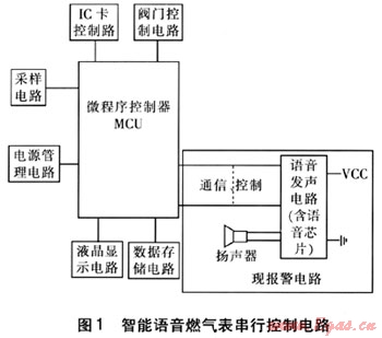 智能語音燃?xì)獗砜刂齐娐分饕呻娫垂芾黼娐?、采樣電路、液晶顯示電路、數(shù)據(jù)存儲(chǔ)電路、IC卡控制電路、閥門控制電路及報(bào)警電路組成MCU的外圍電路組成,這些電路由MCU進(jìn)行統(tǒng)一管理,協(xié)調(diào)各部分電路的工作。語音燃?xì)獗砭褪菍⒃瓐?bào)警電路部分去掉,用現(xiàn)報(bào)警電路替代,以實(shí)現(xiàn)語音報(bào)警功能。