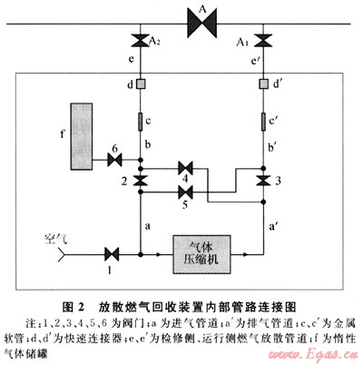 回收裝置通過耐壓金屬軟管,分別與隔離閥門兩側(cè)(檢修側(cè)、運(yùn)行側(cè))的放散閥門管道連接,位于檢修側(cè)(A2)為進(jìn)氣管路,運(yùn)行側(cè)(A1)則為排氣管路。金屬軟管借助于特制的快速連接器與放散管道相連接,選擇不同口徑的快速連接器接頭,可實(shí)現(xiàn)同一條金屬軟管管與不同管徑放散管道快速聯(lián)通,以節(jié)省安裝時(shí)間。