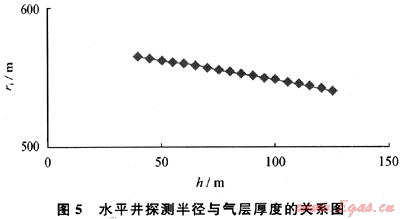 給定氣層厚度40~125m,其他參數(shù)同前,由式(8)得出探測(cè)半徑與氣層厚度的關(guān)系(圖5)??梢钥闯觯簹鈱雍穸仍龃?,探測(cè)半徑減小,但減小的幅度很小。此即說(shuō)明滲流截面積越大,壓力波向地層推進(jìn)越慢。